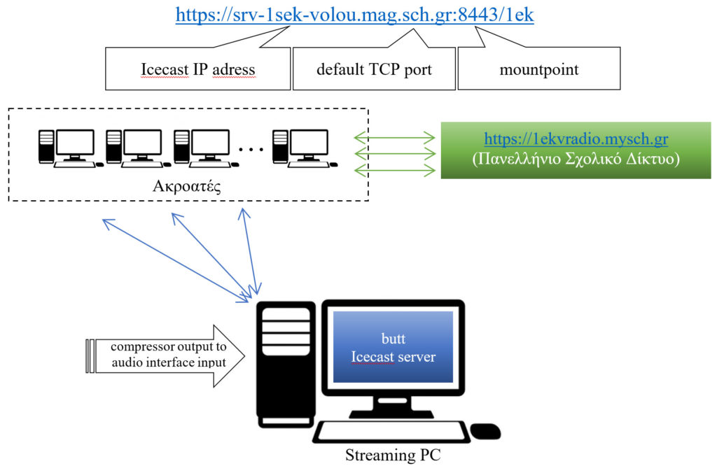 Η επίτευξη ροής μουσικών δεδομένων γίνεται με αξιοποίηση του ελεύθερου εργαλείου butt (broadcast using this tool) σε περιβάλλον Windows. Το ραδιοφωνικό περιεχόμενο οδηγείται από την έξοδο του συμπιεστή στην είσοδο της κάρτας ήχου του Η/Υ στον οποίο έχει εγκατασταθεί το butt. Η ροή μουσικών δεδομένων που παράγει το butt (streaming tool) εισάγεται στον ελεύθερης πρόσβασης εξυπηρετητή Icecast (streaming server), έπειτα από δημιουργία σχετικού λογαριασμού/προφίλ. Ο Icecast μεταβιβάζει τη ροή στην IP διεύθυνση του Η/Υ στον οποίο είναι εγκατεστημένος, σε συγκεκριμένη θύρα (default TCP 8000) και σε ένα συγκεκριμένο σημείο προσάρτησης (mountpoint) το οποίο δεν είναι τίποτε άλλο παρά ένα μοναδικό όνομα για κάθε εξαγόμενη ροή που δέχεται το λογισμικό. H ροή του προγράμματος έχει ρυθμιστεί στα 128Kbps με κωδικοποίηση mpeg1-layer3 (mp3).